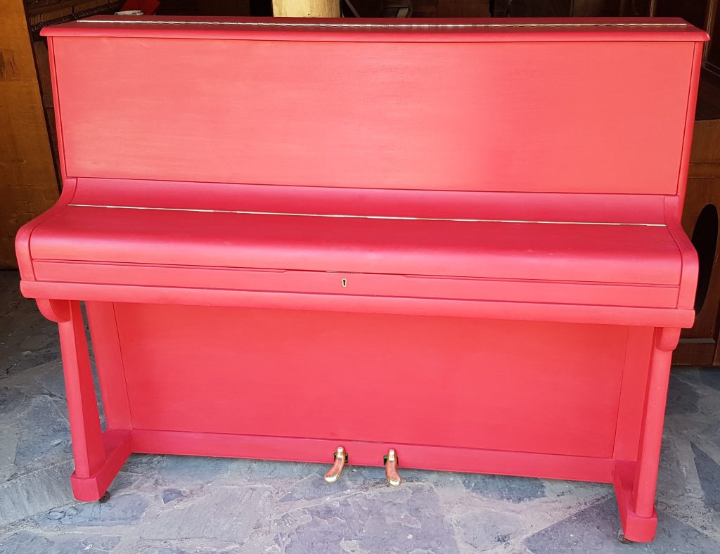 This piano was manufactured in London. It is a lovely, small piano with interesting legs. Due to wear on the casing the piano was painted with a red chalk paint (June 2017).