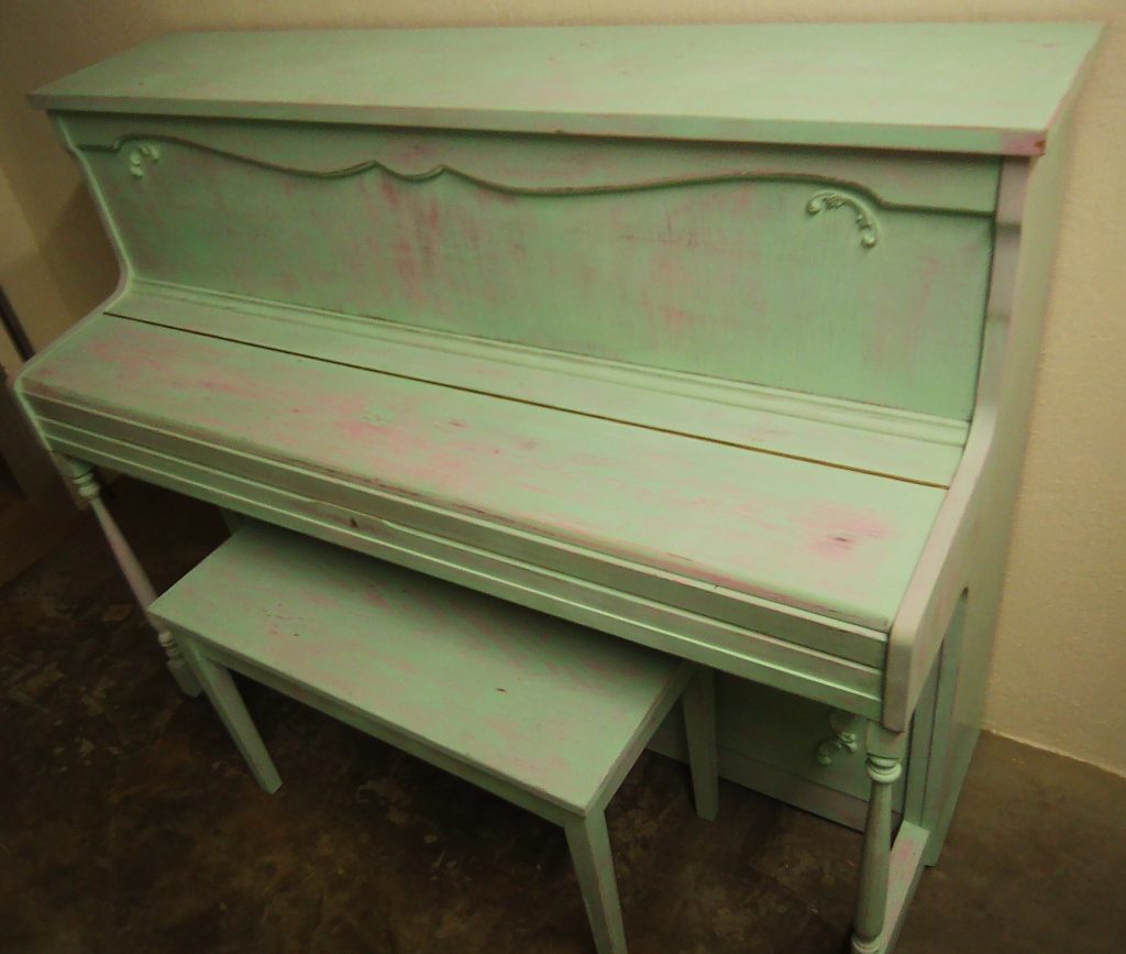 The piano was painted with a dark grey-brown undercoat, a middle coat of Granny B’s Candy Floss pink and a topcoat of Celtic Mist green. Then it was distressed to reveal the dark layer subtly, but the second layer of pink more so.