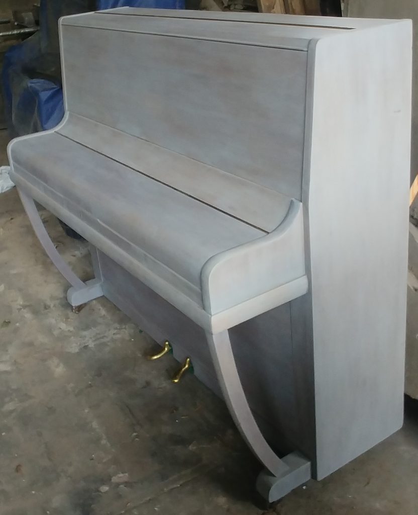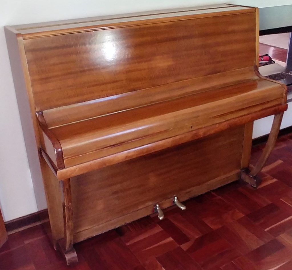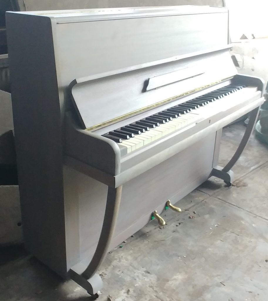 Serial number: 84071. This piano was manufactured in 1955, in London, England. Although it had a lovely shade of mahogany for its casing, the casing was in need of a re-polish. It was done in the Gris Belge shade of Rubio Monocoat (January 2019) – giving it a washed, low-lustre, grey finish which we have found very popular.