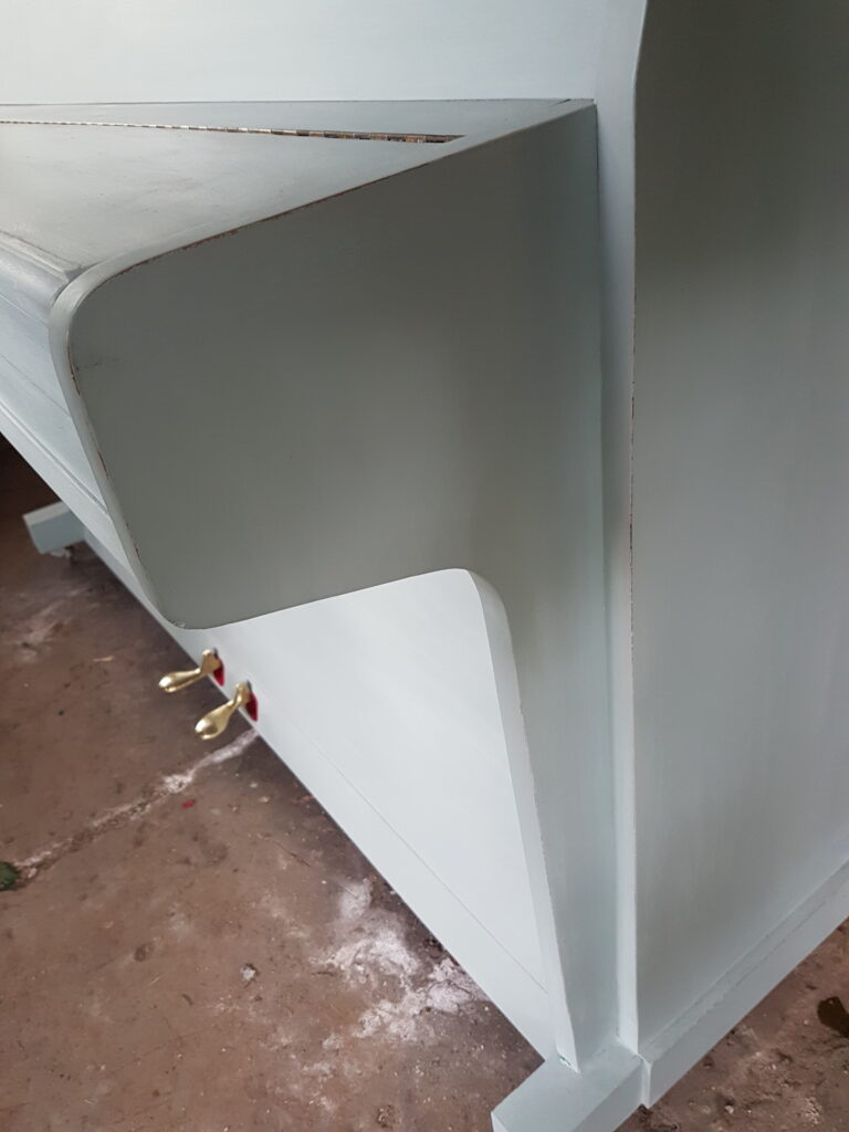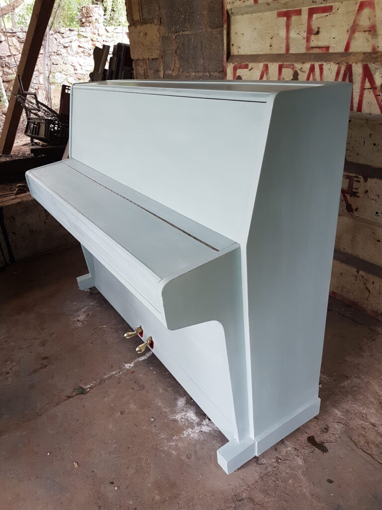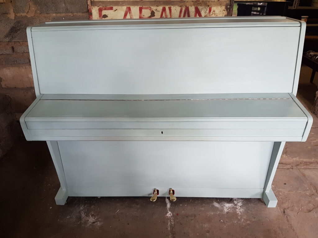 This piano has been painted a ‘bath’ blue (a lovely light blue) over a beige-grey, the top coat has been very subtly distressed to reveal the undercoat. It has a remarkable presence. This is a premier quality piano with a heavier touch, well suited to a more experienced player.