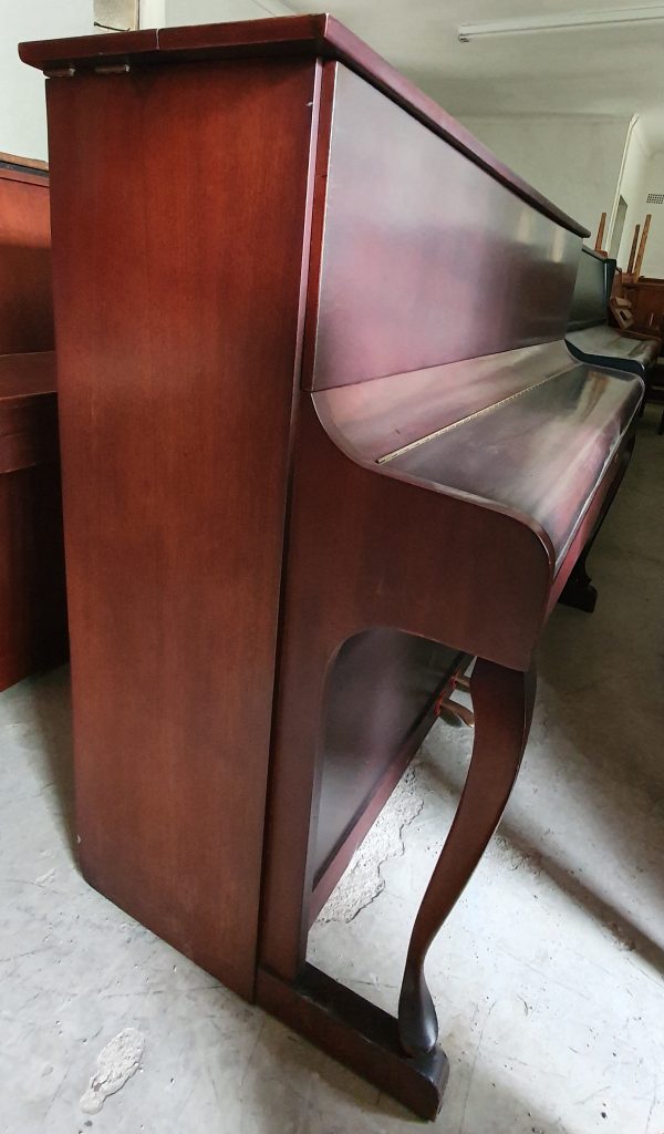 Serial number 6564. This piano was manufactured in the Dietmann Factory in the Cape, South Africa, in around 1985. These were built as a higher quality piano for sale at a higher price than other pianos from the same factory and have the German Renner action and keys, giving a medium to heavier key touch. It has a very attractive mahogany casing with Queen Anne legs. The top lid is able to lift in a grand piano style.