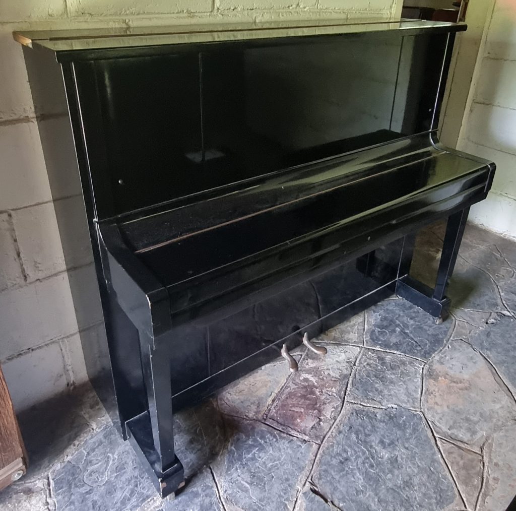 This tall model upright certainly lives up to this expectation and offers an unusually full rich tone not really achievable in small uprights. Eastern zone pianos of this era carried an often more favourable rounder tone quality compared to later examples. This high gloss black-cased beautiful piano is a feature piece as well as a quality instrument! Please note that the photographs have been taken as the piano arrived and it is in a dusty state, in need of polishing.