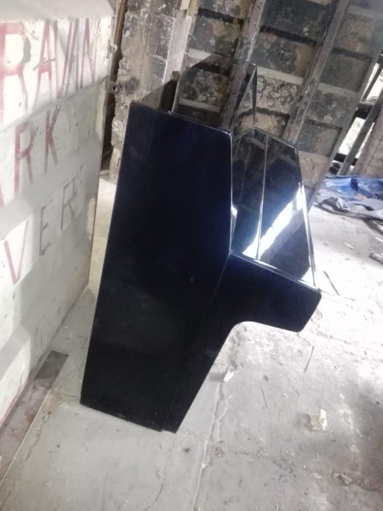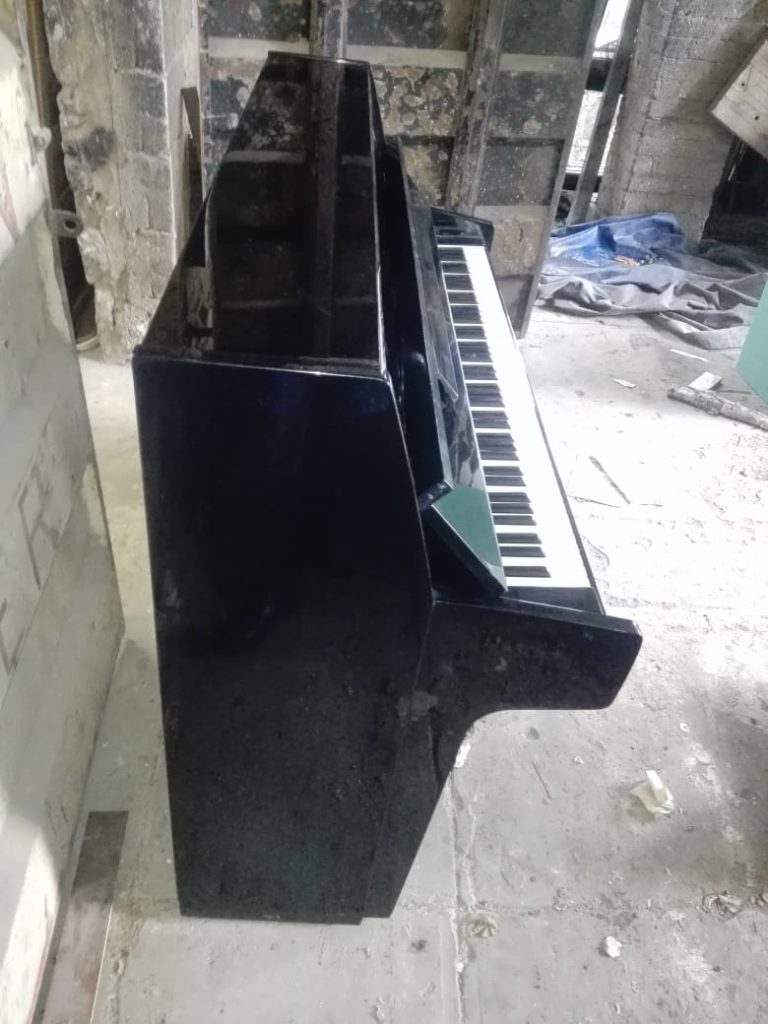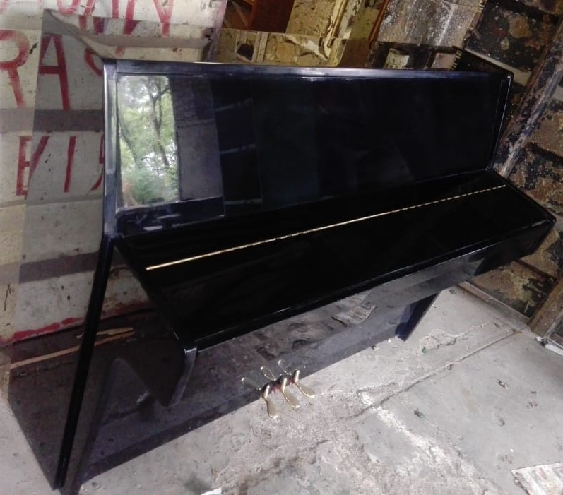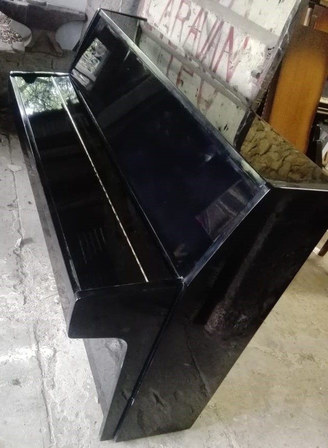 This piano has been re-polished to a high gloss black finish (November 2019). View the photographs to see what a high gloss black finish should look like – the casing reflects the background like a mirror.