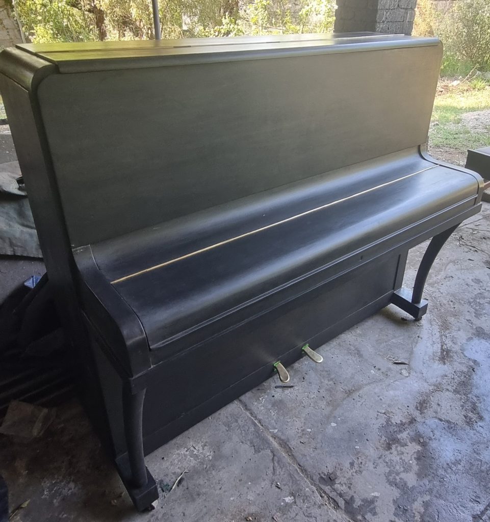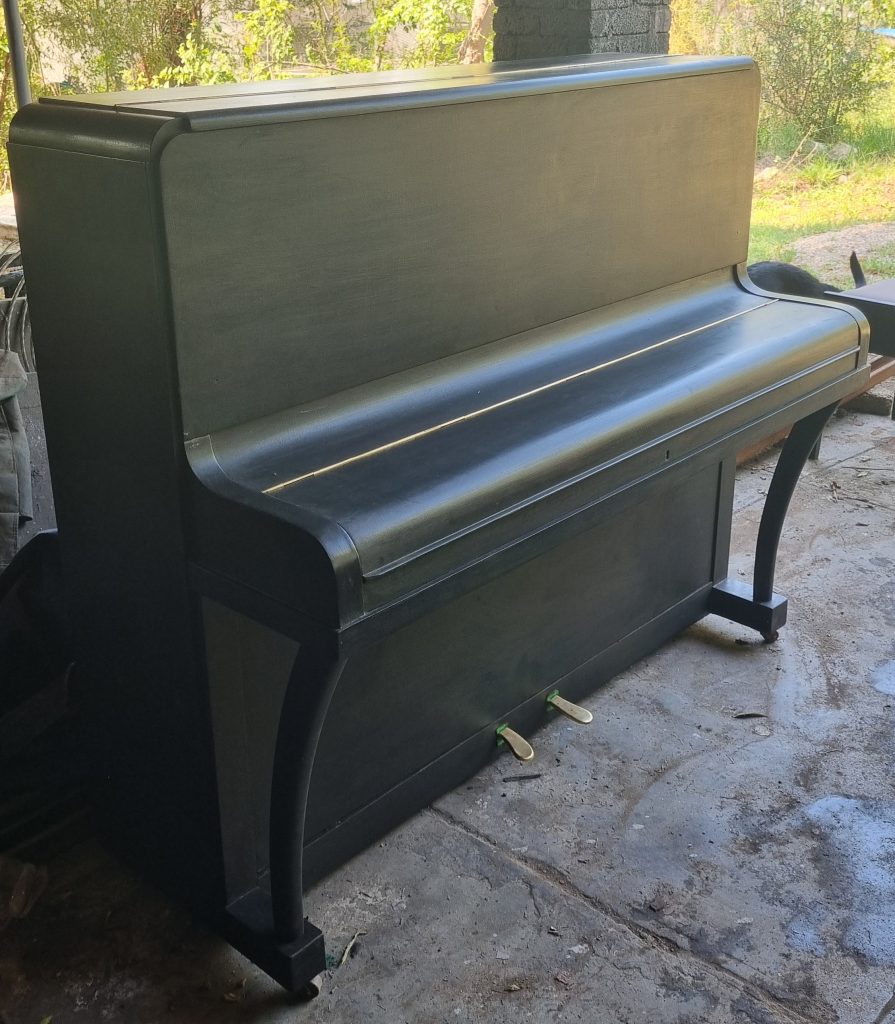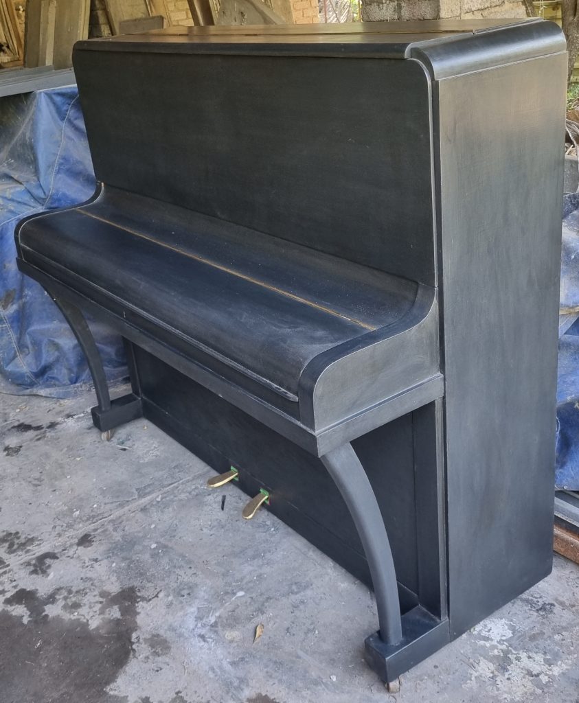 Serial number: 11989. This piano was manufactured in London, England in about 1930. This is an example of an English Reconditioned piano. There is more information about English modernised pianos below the photographs. We have just finished painting this piano with Granny B’s Black Betty chalk paint and it now has a textured look (March 2024).