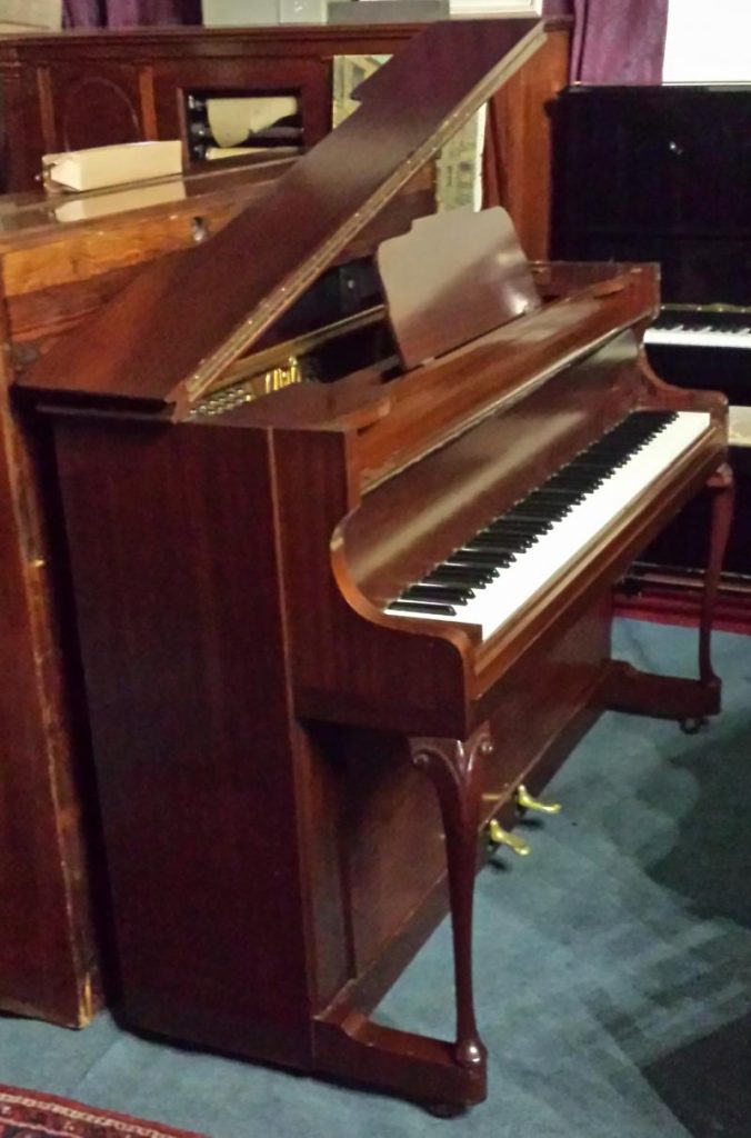 Kemble, a manufacturer of pianos based in London, has been known for their compact design of pianos. This is the Cameo Model Kemble. The top of the piano can be tilted with a top stick as with a grand piano. This adds such a lovely character to an upright piano. This pretty piano has a mahogany casing.