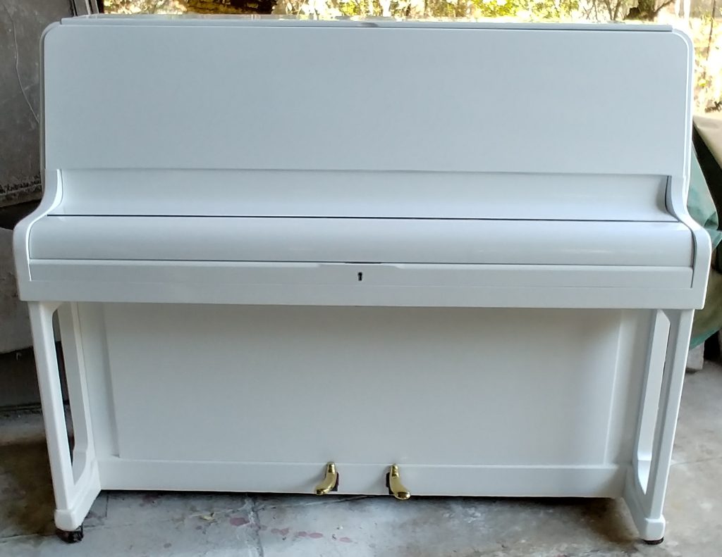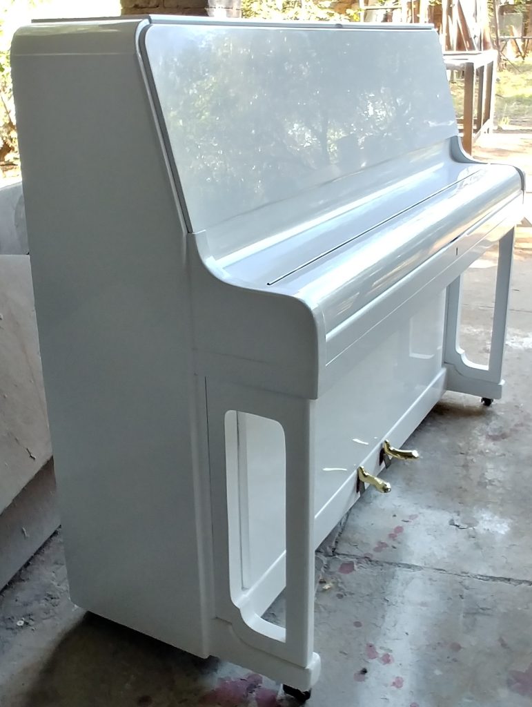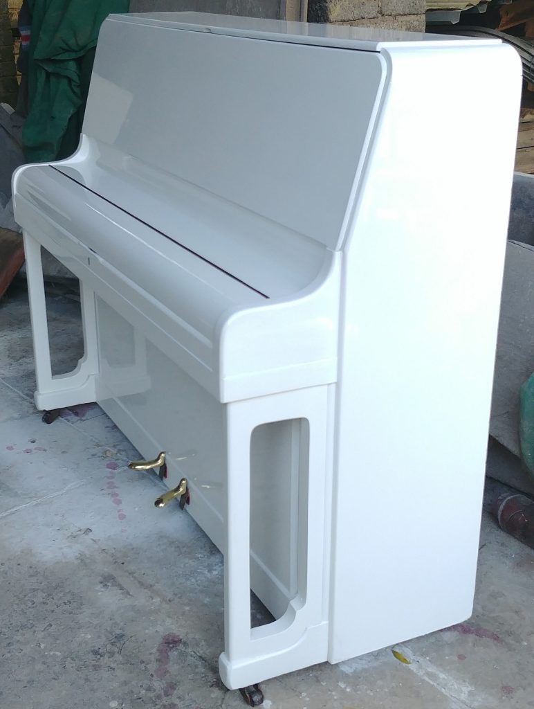 Serial number 94814. This piano was built by Kemble of London. Eshelby Pianos repolished the casing to a high gloss pure white finish in March 2018. Note the reflection of the trees in the top panel of the photo to the left. It is a smaller piano with an impact!