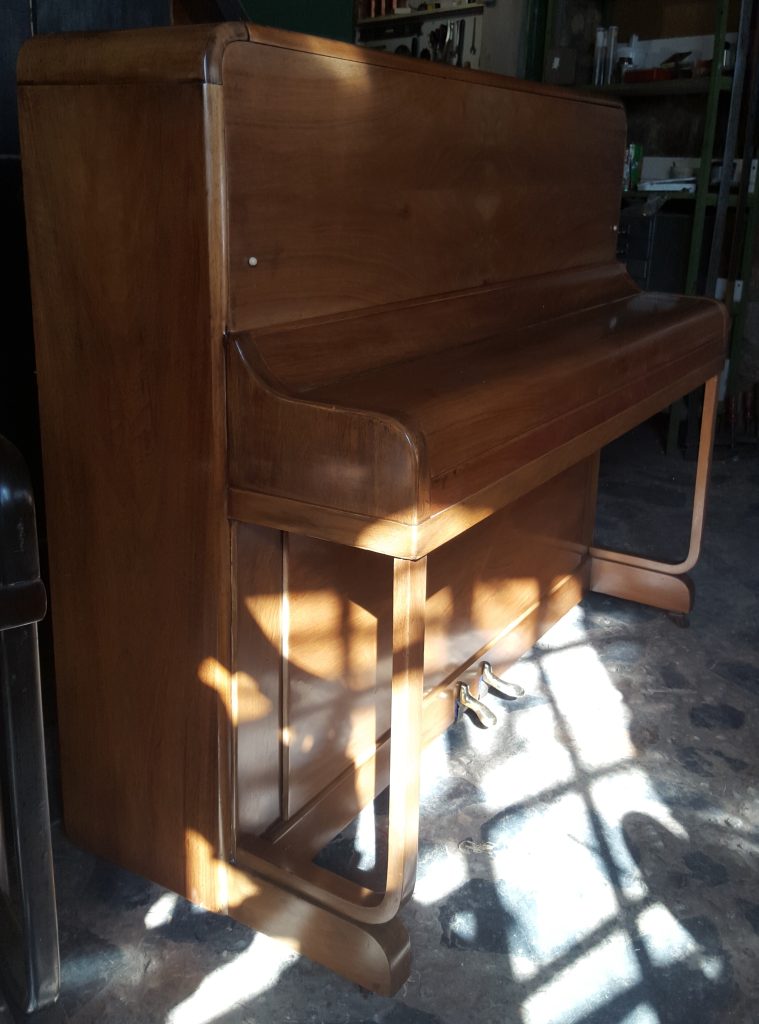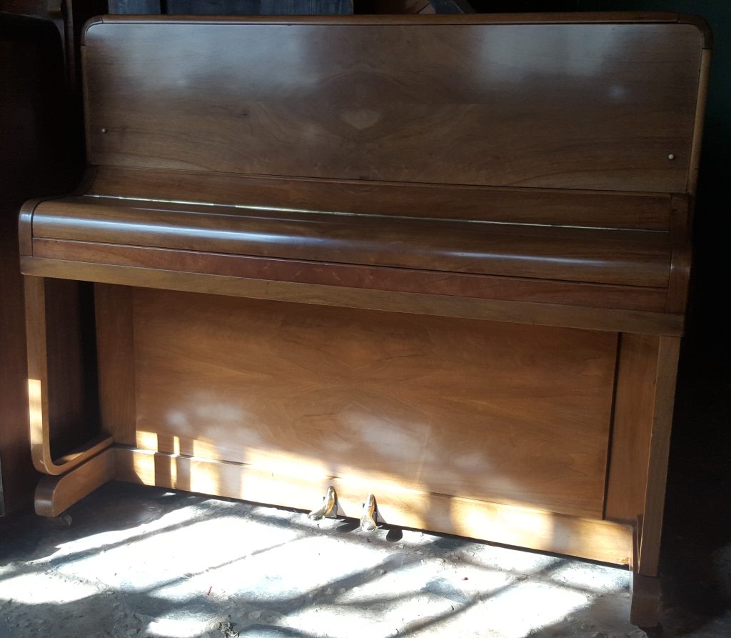 It has a light walnut casing which was repolished in July 2016. One needs to stop for a moment to consider the craftmanship that goes into matching veneer. Here is a brilliant example of the impact of this effort! This is truly just a lovely piano: clean, neat and faultless.