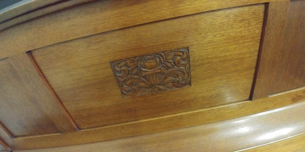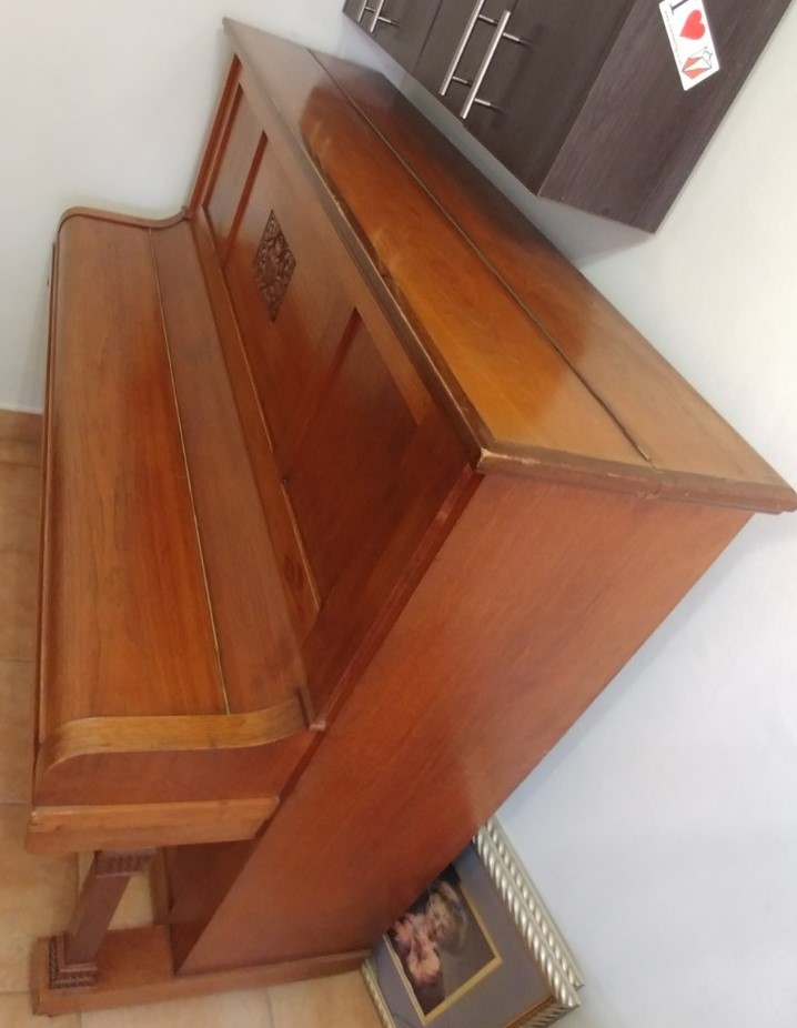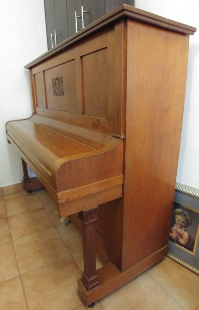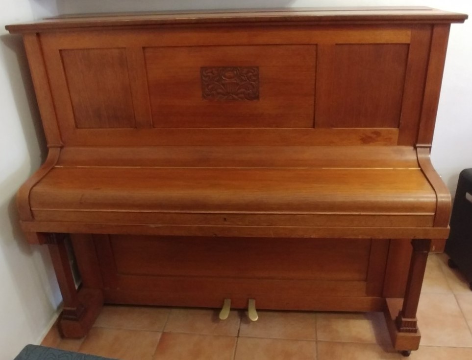 Serial number 231B. Manufactured in Meissen, Germany in 1915, this piano has a walnut finish. It is a lovely piano with carved detail in the top front panel, contrasting square legs and original ivory keys in good condition.