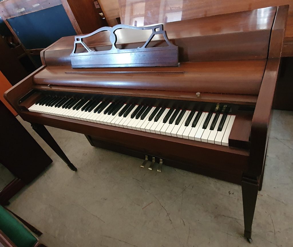 Serial number: 55255. This is a spinet model, built in the USA, and has a mahogany casing. It is a lovely small piano – with a dainty appeal.