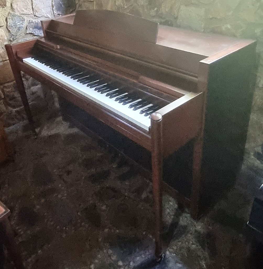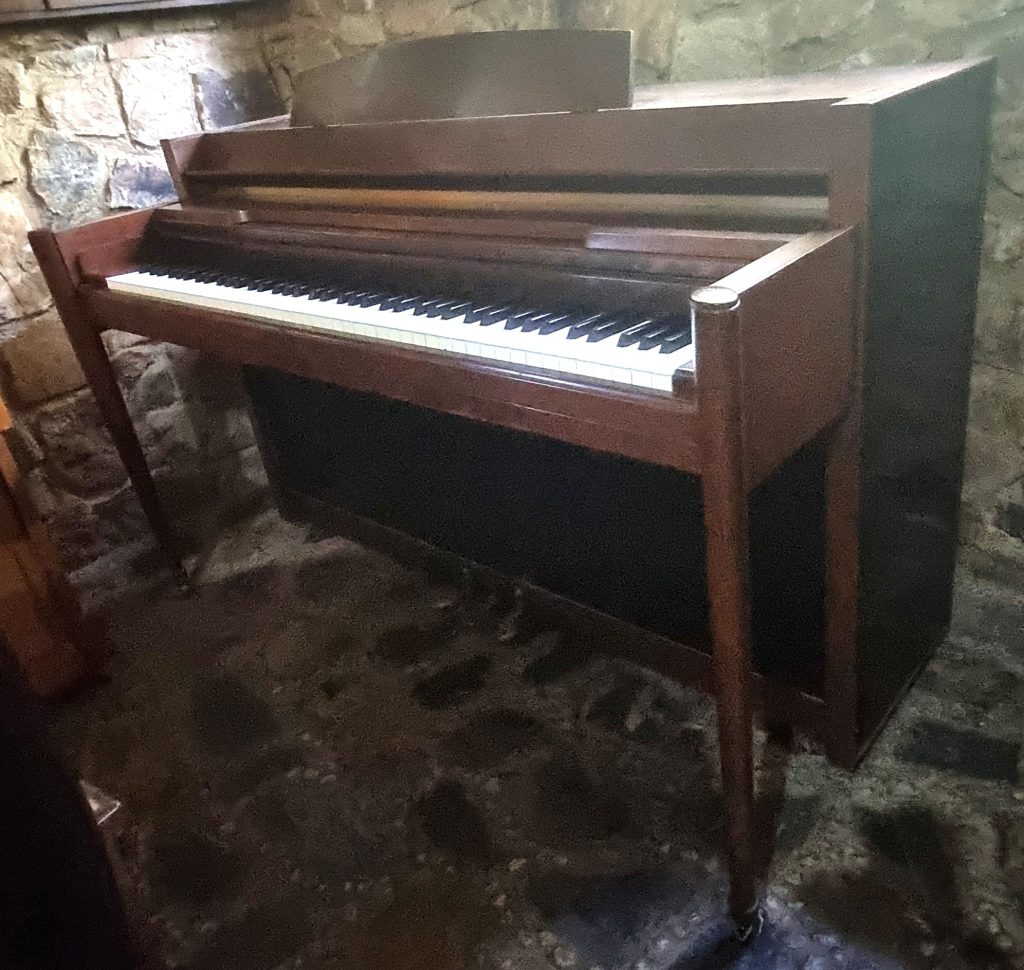 In a very unusual two-tone mix of satin black and walnut, the appearance is very clean and smart, somehow it lends a solid feel to the piano. The stool matches the tapering rounded legs. This piano would fit in most homes.