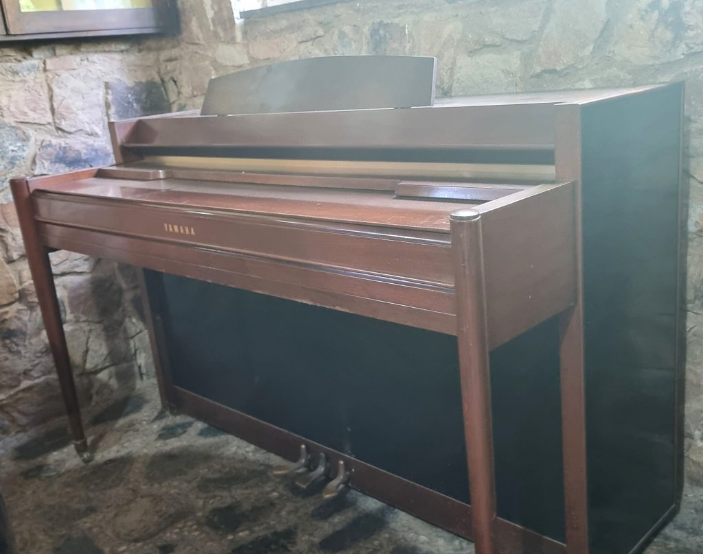 The tone is lively and rounded with a surprising volume for a small piano. The piano has 88 keys and 3 pedals. The middle pedal operates the bass dampers only. The keys have a medium to firm touch. We like the touch from these spinet Yamahas as the action design means you are picking up rather than pushing forward the hammers and action movements – which gives a pleasantly firm feel. The dimensions are a height of 93 cm (with the music desk down), a width of 145.5 cm and a depth of 68 cm.