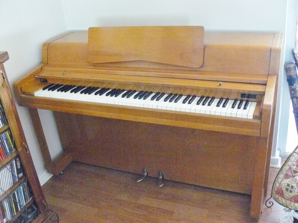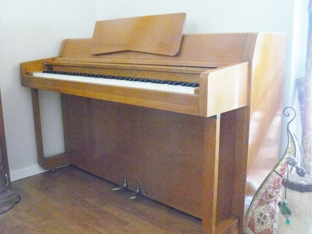 This piano was manufactured in 1957. It has a light birch-maple wood casing. The spinet-style has remained ever-popular, due to the neat appearance it offers.