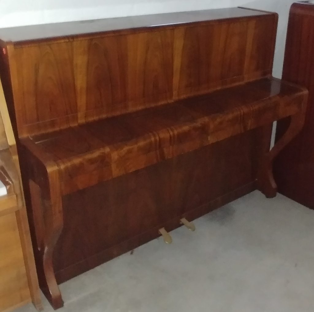 Serial number: 176584. Manufactured in Liepzig, Germany in 1950, this piano has a figured walnut casing with beautiful graining. It is an extremely clean conditioned example of this well-considered, high-quality manufacturer. This piano has a good action and touch that which would suit a serious player.