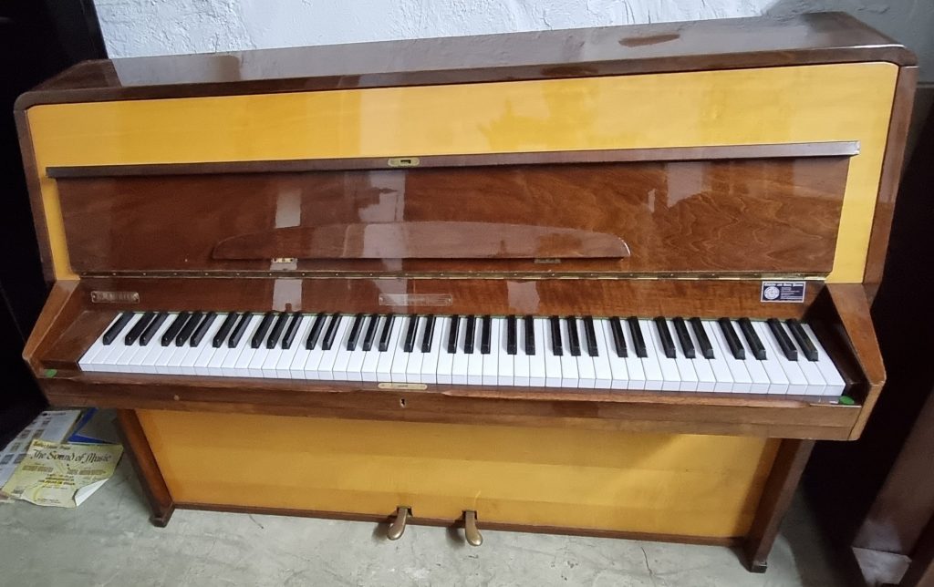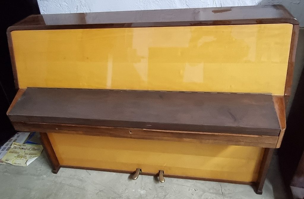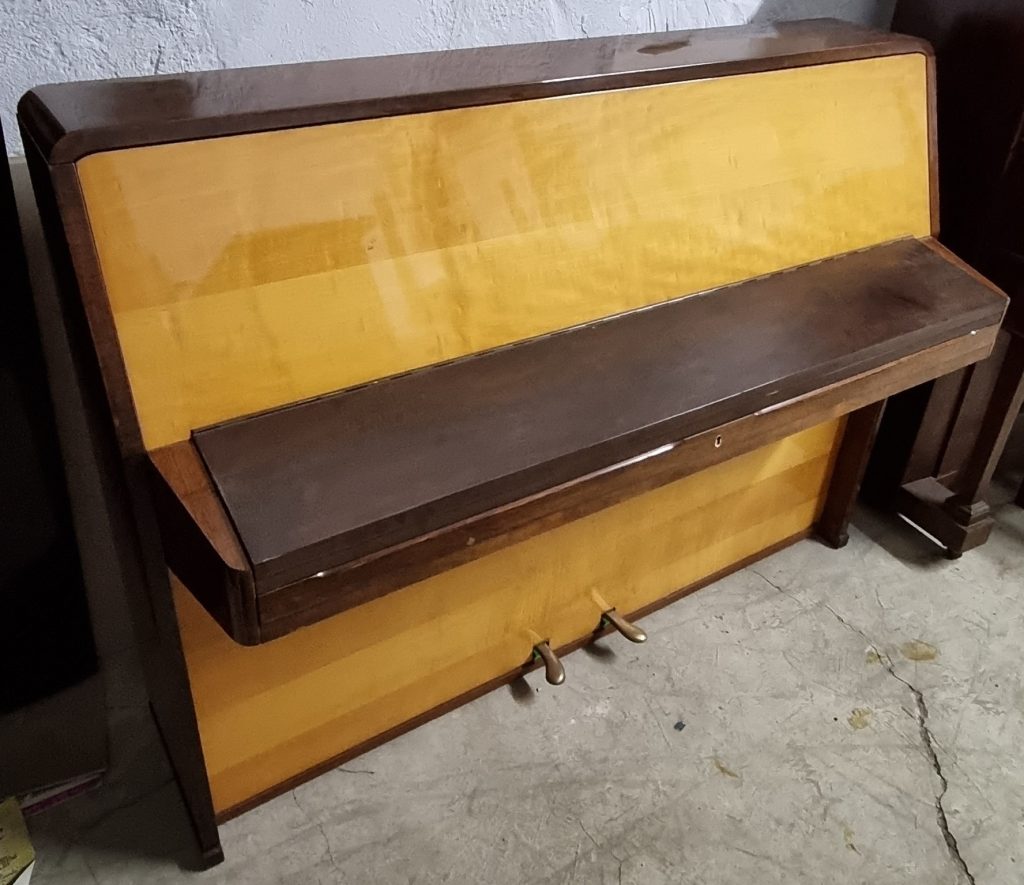 This piano has a two-tone casing finish, which is rather unusual. It has mahogany sides and framing with Beechwood golden-yellow panels.