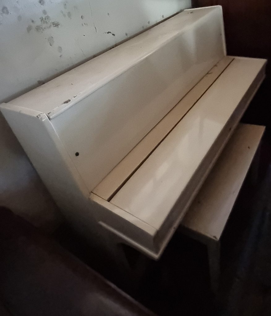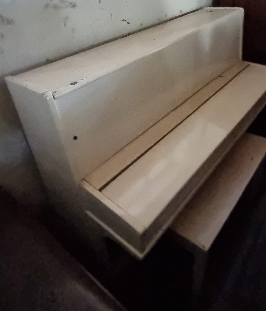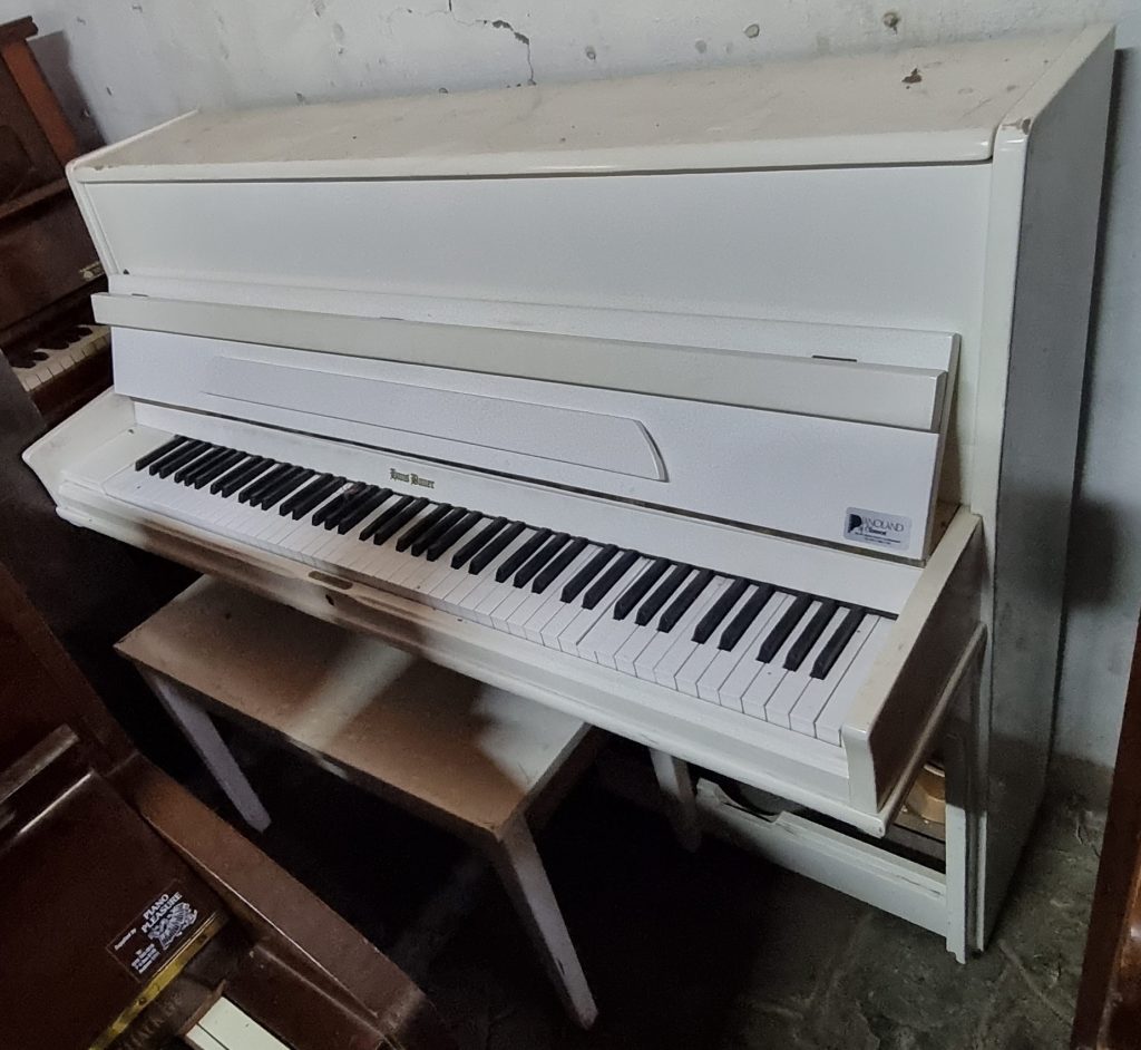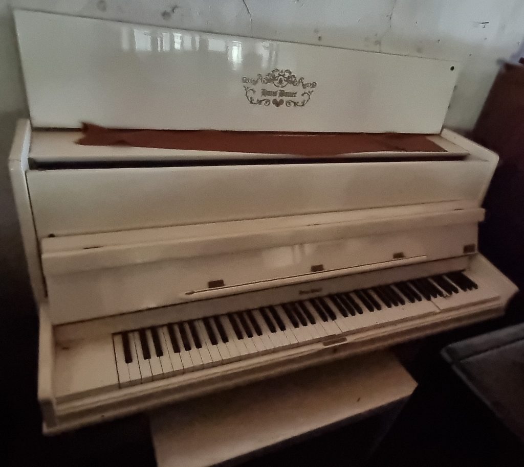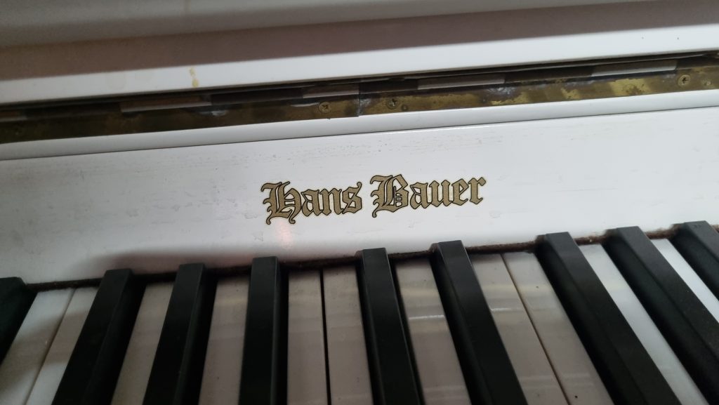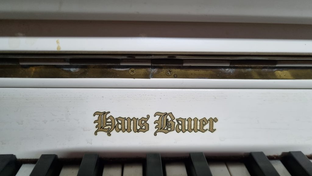 Serial number: 75007. Branded a Hans Bauer, this piano was manufactured in the 1980’s in the Dietmann Factory in Wellington, in the Western Cape Province of South Africa. The piano currently has a worn satin white finish, the casing needs repair and refinishing, thus we will be painting it with chalk paint.