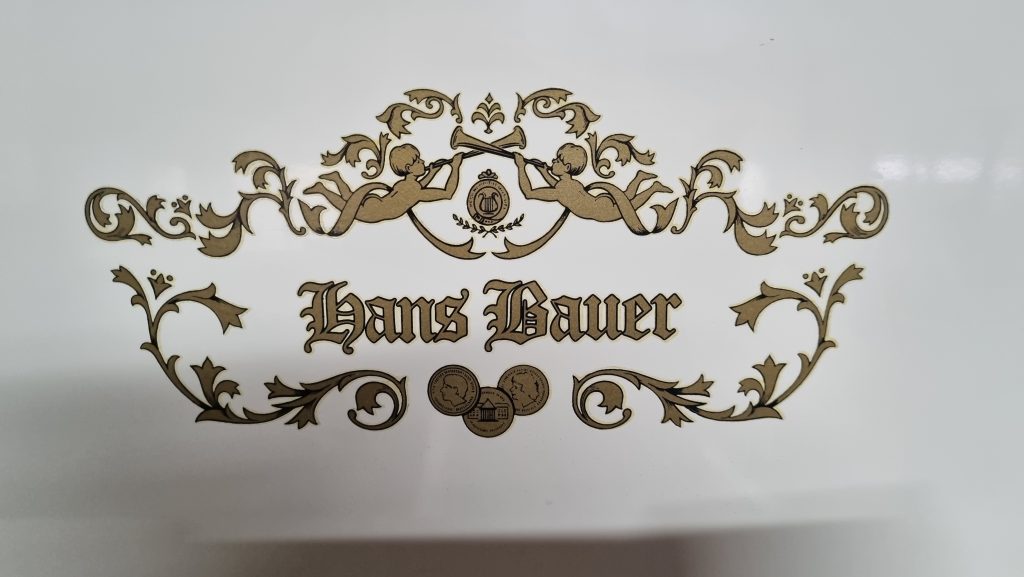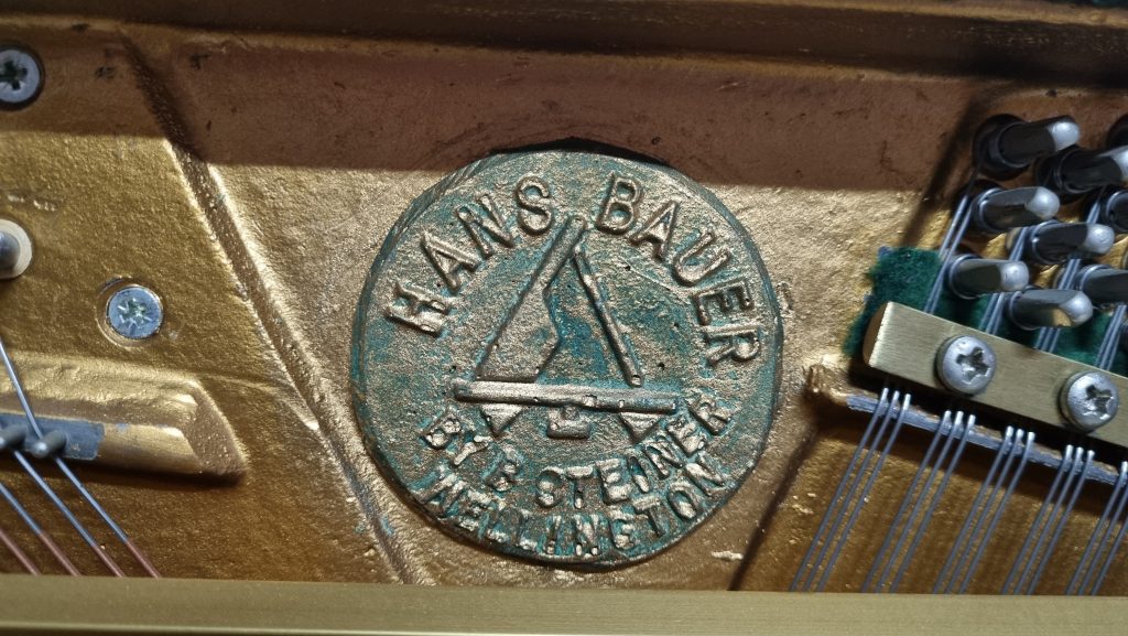 This is an interesting brand! Although stated that Hans Bauer pianos were manufactured in the Dietmann Factory in around 1955, and manufactured in Johannesburg in 1968, the frame detail confirms that it was manufactured in the Dietmann Factory, stating: Hans Bauer, By B. Steiner, Wellington.