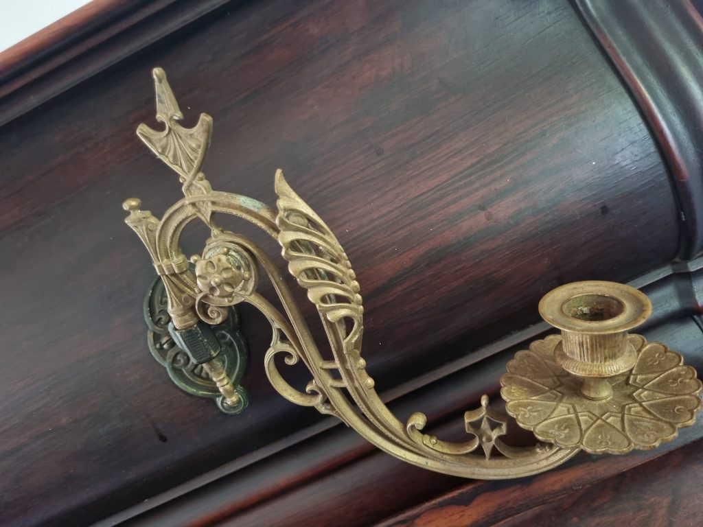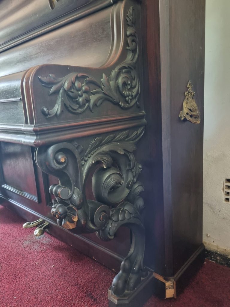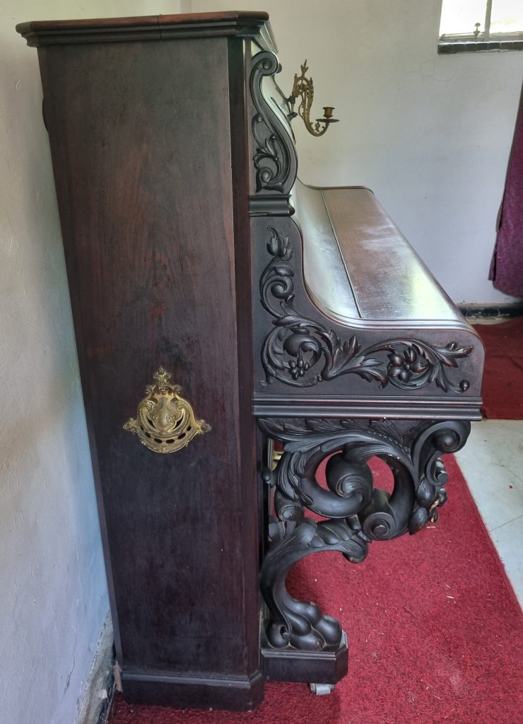 The tone is a deep rich sound, with surprising range. Making this exceptional in that often an ornate antique piano is not really a serious playing piano, but this ought to suit even a serious player. The keys are original ivory clad. The piano has 85 keys (original ivory-clad keys) – with a medium to lighter touch weight and 2 pedals. The dimensions of the piano are a height of 128.5 cm, a width of 161 cm and a depth of 68 cm.