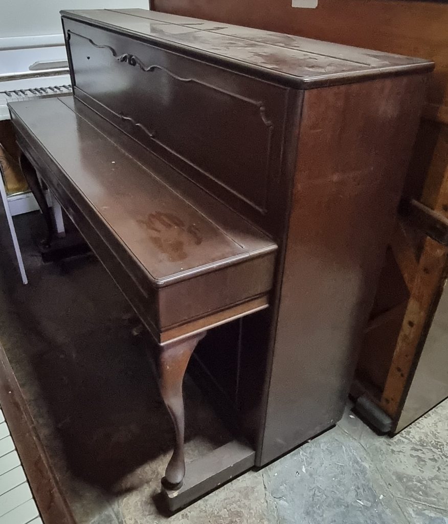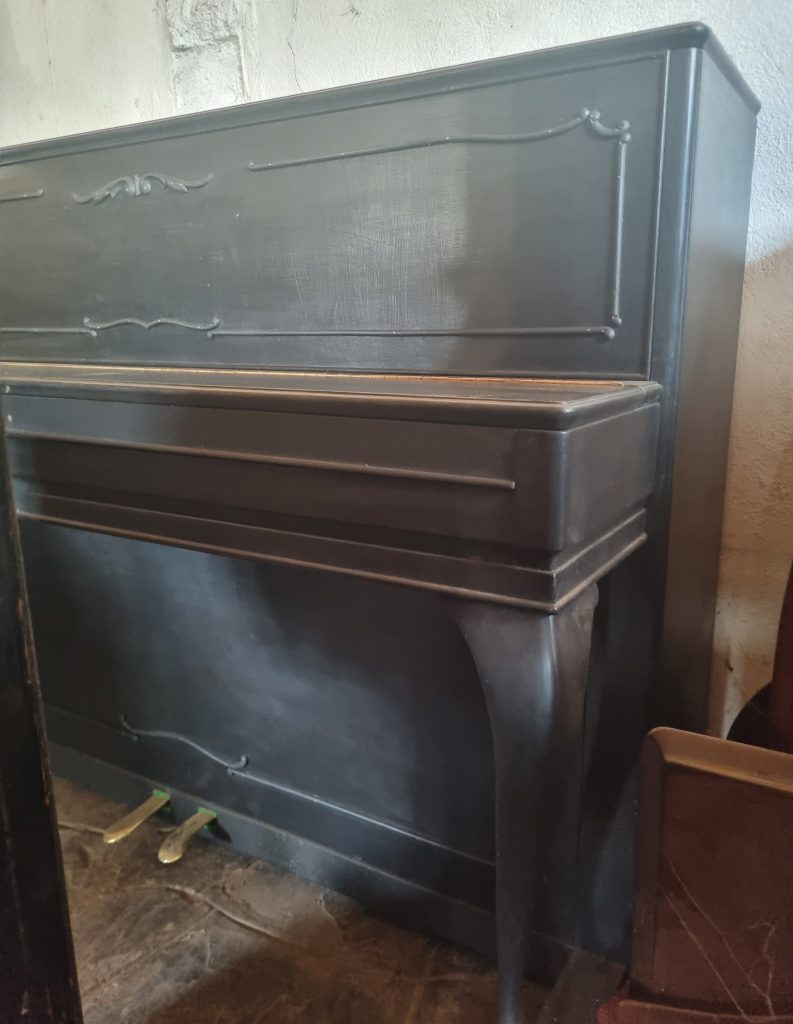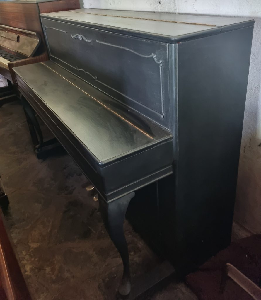Serial numbers: 3087 & 83573. This piano was made in Copenhagen, Denmark, in 1955. It currently has a mahogany casing. Showing beautiful details on the casing, this is an absolutely lovely little piano of superb quality. Better yet, its casing has just been painted with the Black Betty shade of Granny B’s Chalk Paint (07/2025).