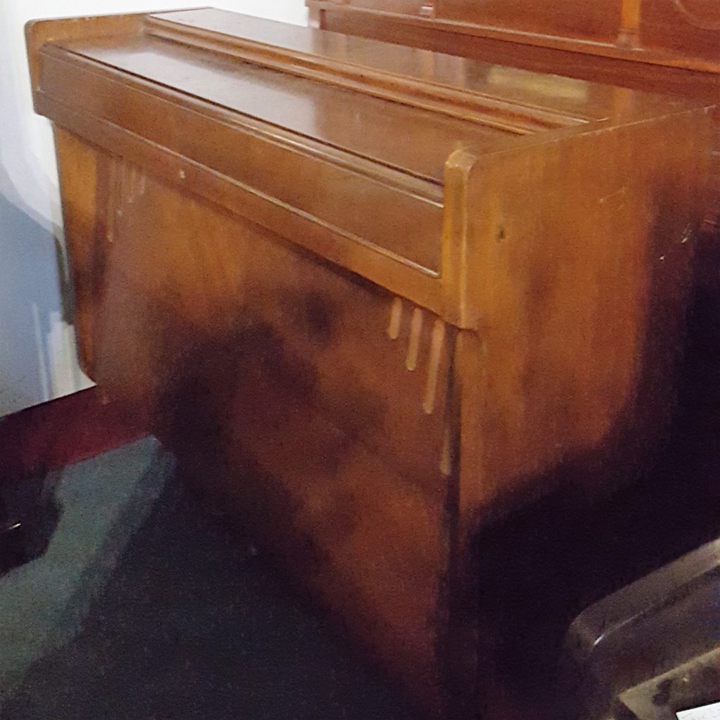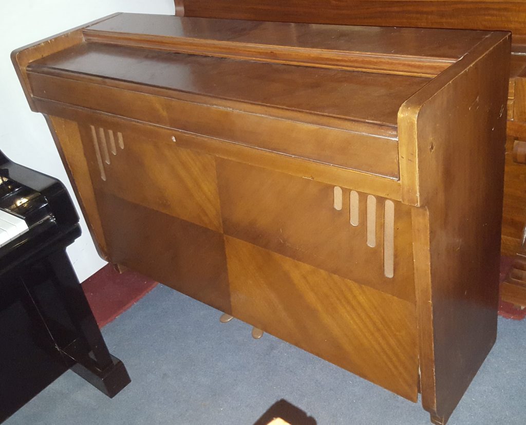 This piano was manufactured in Germany and has a walnut casing. The unique size and structure of this piano certainly gives it value. It is something unique. The contrasting veneer in the quad divided bottom panel is striking. We will be re-polishing this piano.