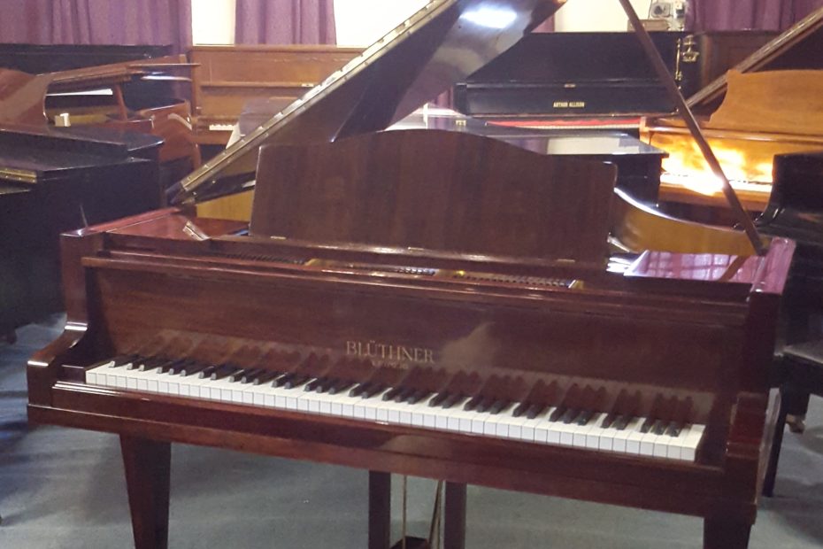 Serial number: 122803. This piano has a flame-mahogany casing we, Eshelby Pianos, re-finished July 2016.… Read More »Blüthner Grand Piano (942)